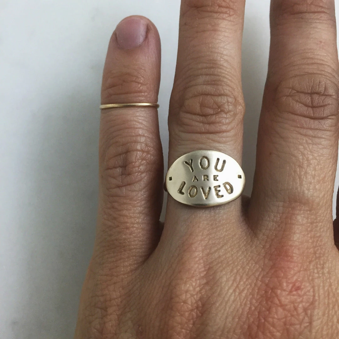 Wear the You Are Loved Ring on days that you might feel lonely… But just know, YOU ARE LOVED. The petite ring is hand-stamped and cast in bronze.Â