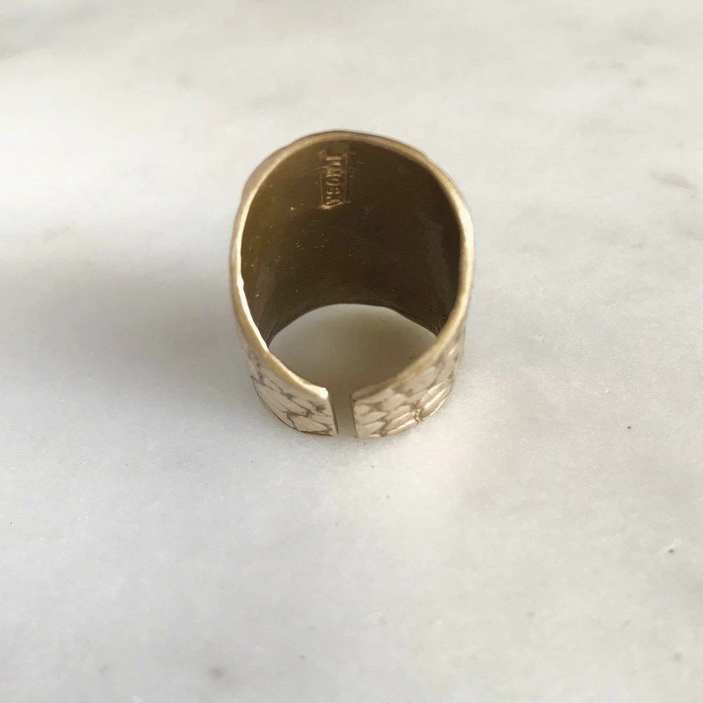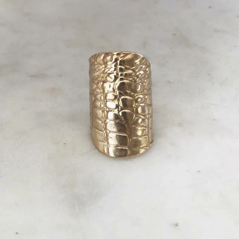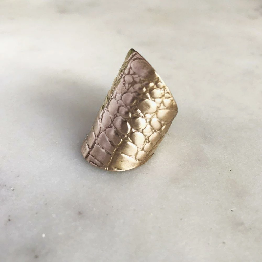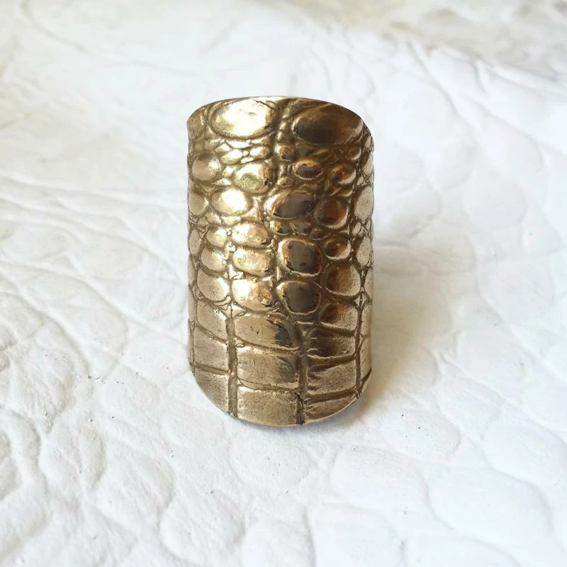 Switch up your style with the Alligator Skin Cuff Ring. The ring is hand-stamped to mimic the texture of alligator skin.Â