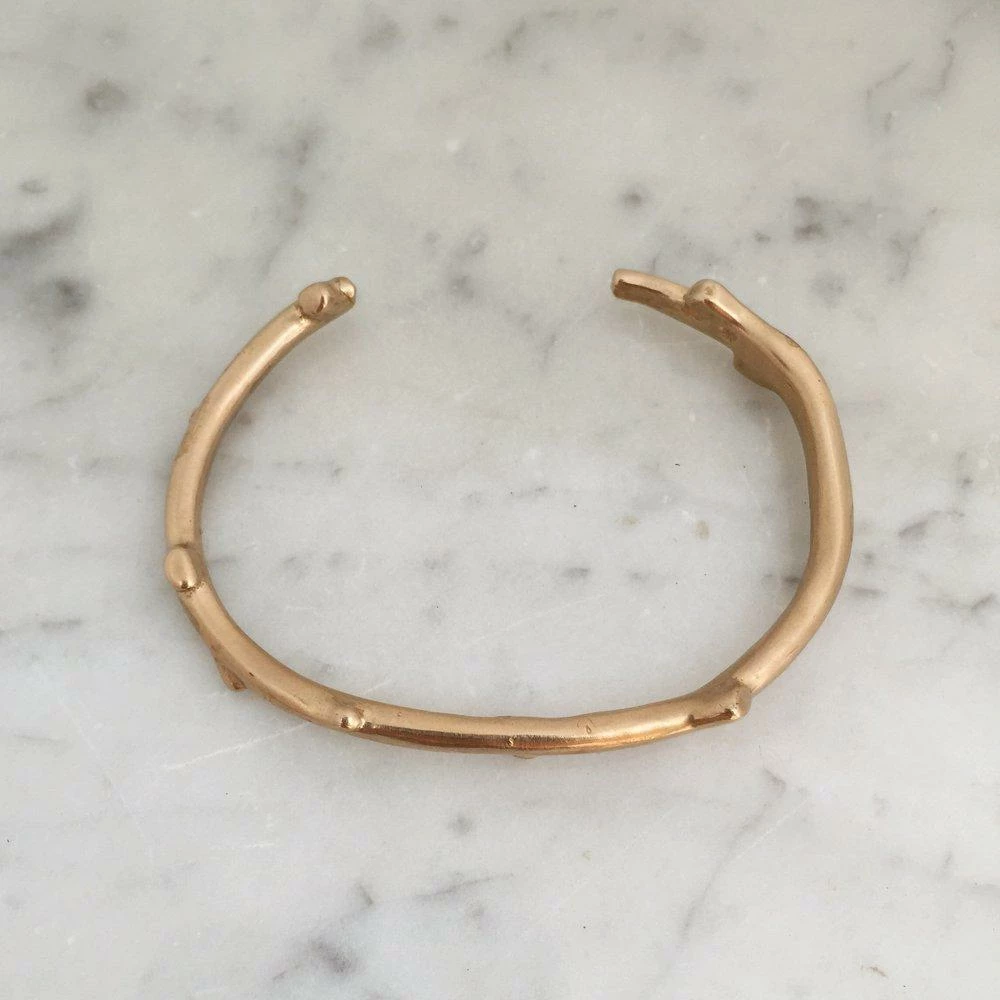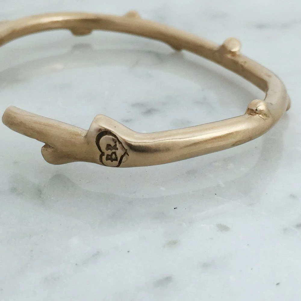 The Red Stick Love Cuff Bangle is a petite bracelet that features our city’s initials etched within a heart into the trunk of a tree.