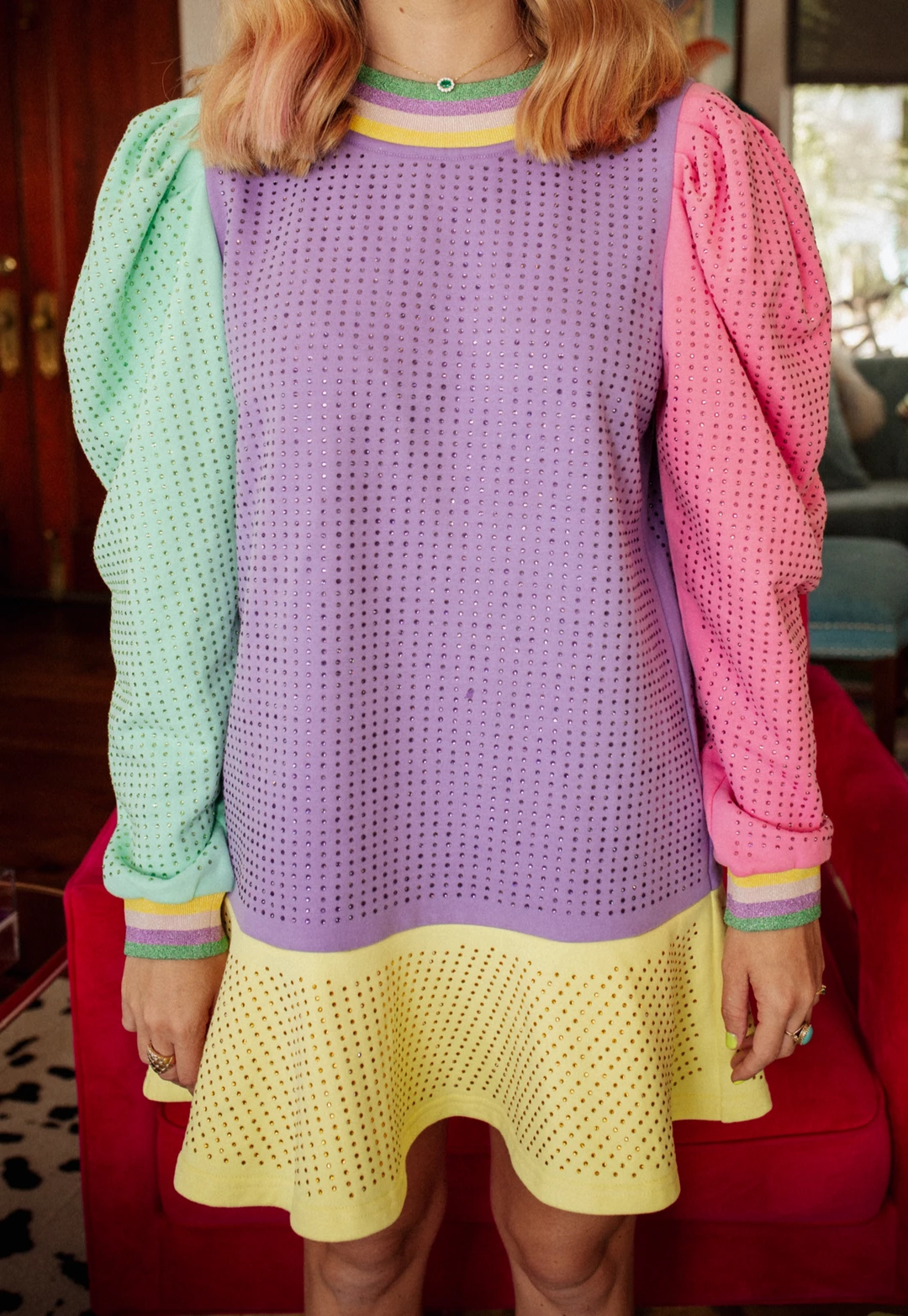 Poof Shoulder Rhinestone Flare Sweatshirt Dress