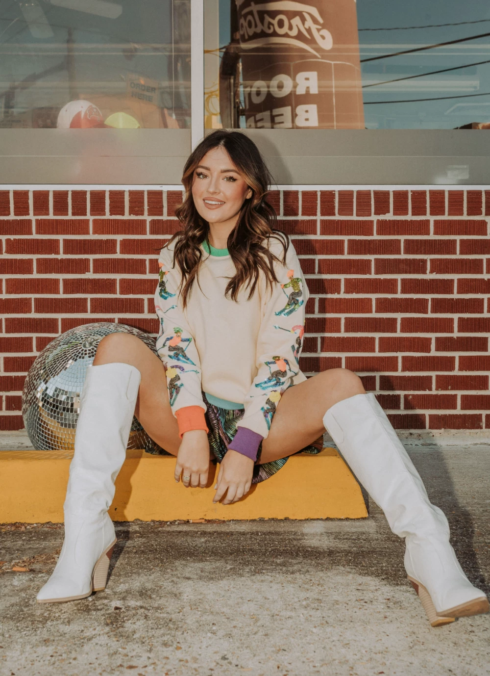 - Tiny sequin skiers slide down your sleeves, making this the most EPIC sweatshirt to wear on the slopes or après ski.Â