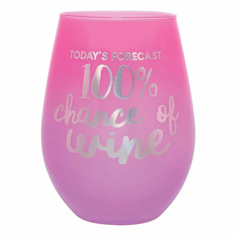 - Pink and purple glass with “Today’s Forecast: 100% Chance Of Wine” in silver lettering