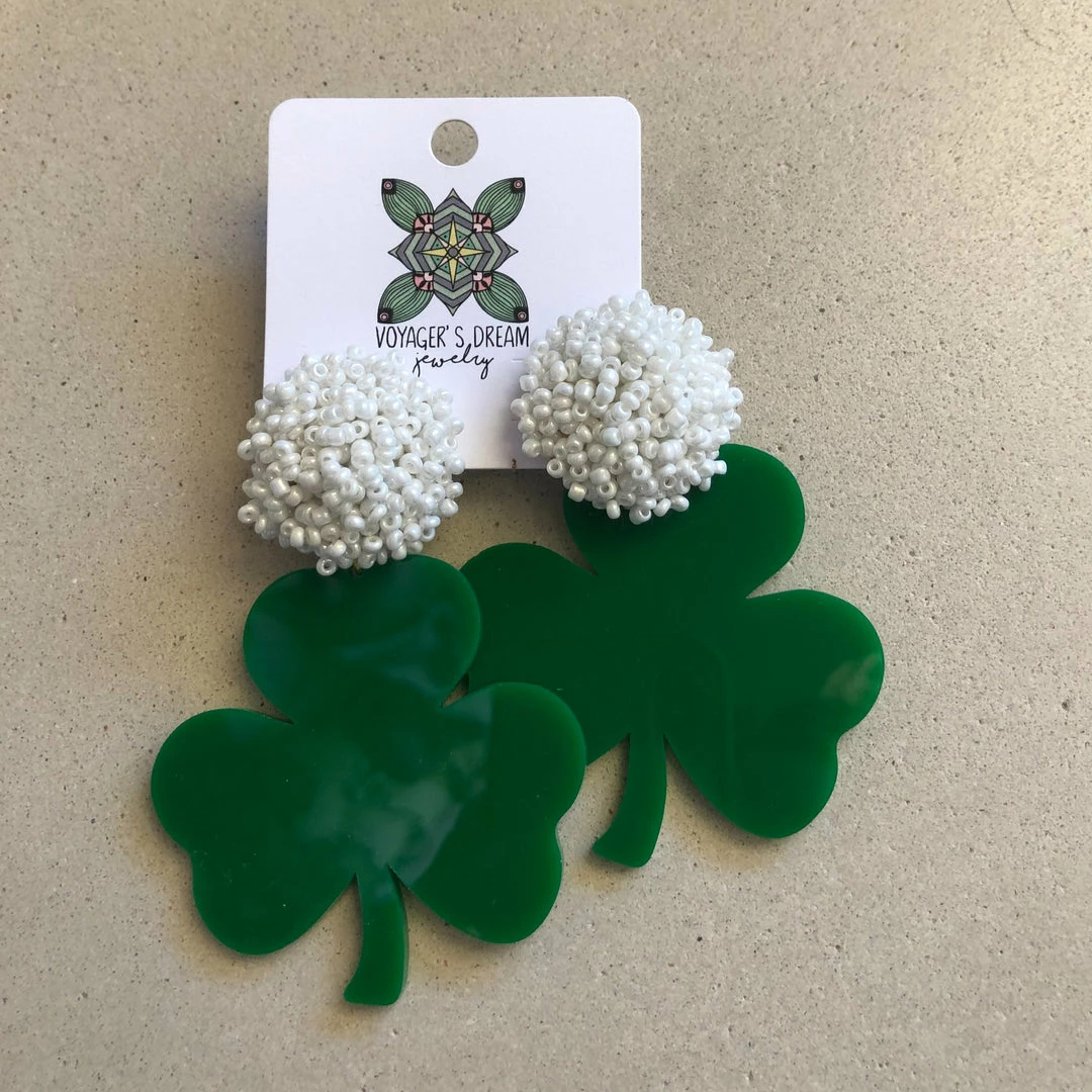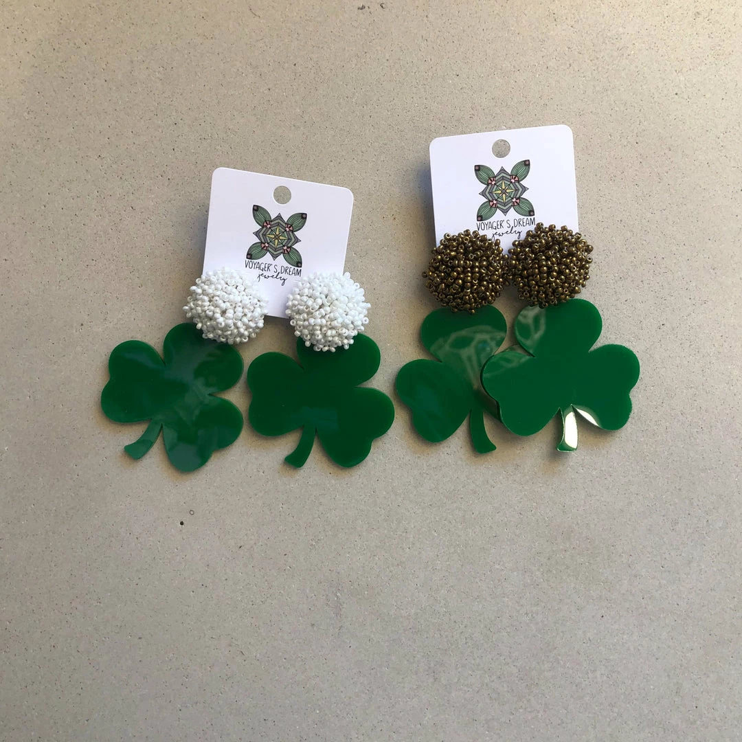 Big acrylic 4 leaf clover earrings with gold or white beaded studs.