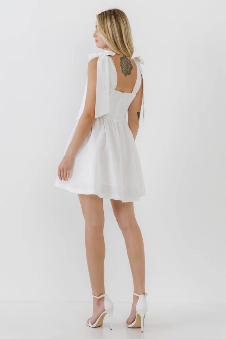 The bowed square neckline baby doll mini is a must-have for every fashion-savvy woman. Made of stretch linen, this dress fits and flares perfectly, creating a flattering silhouette for any figure. The functional bow shoulder ties add a touch of whimsy, while the partial back smocking provides just the right amount of interest. Plus, the non sheer fabric makes it perfect for wear all year round.