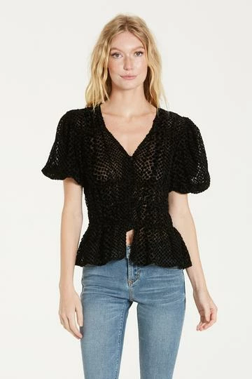 Peplum sleeve v-neck top finished with front empire & waist line details. Embossed solid color woven on regular fit, styled with self covered buttons.