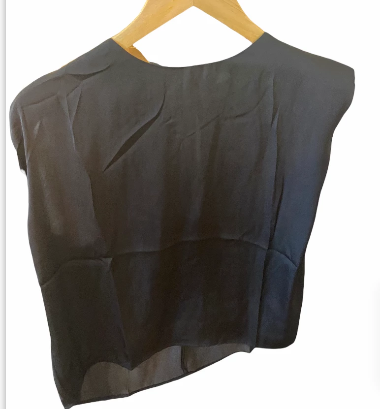 A woven muscle top with padded shoulder and back keyhole with button closures.Â