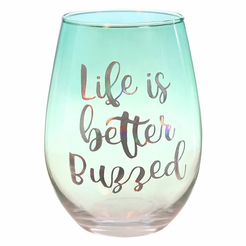 - Blue ombre glass with “Life Is Better Buzzed” in white lettering