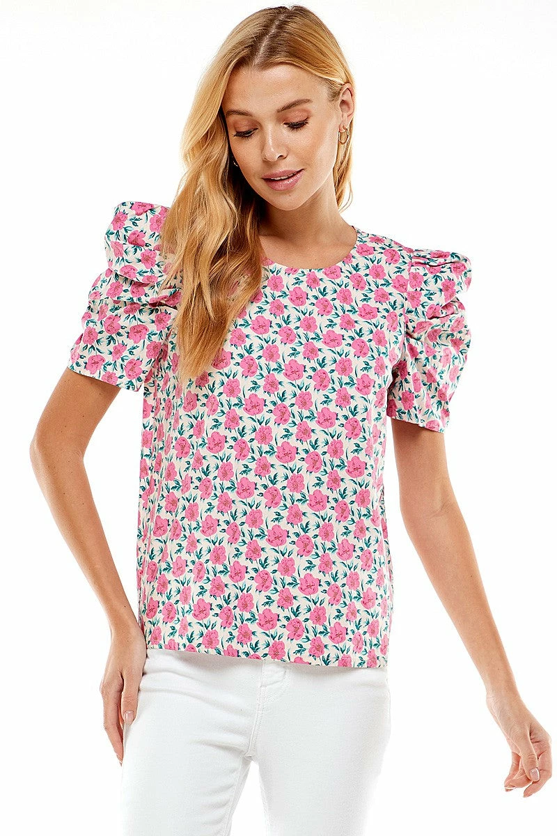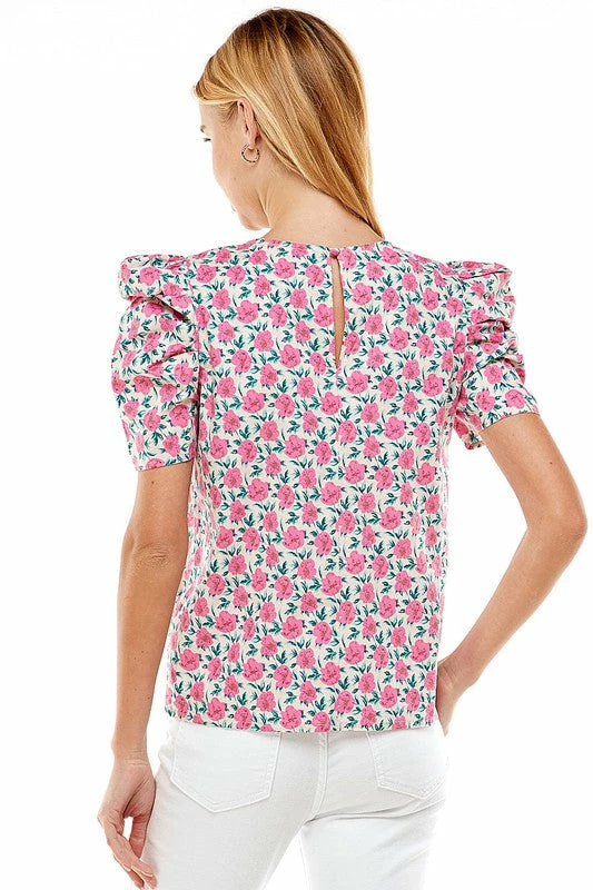 Floral blouse with short, bubble sleeves and straight, relaxed fit.
