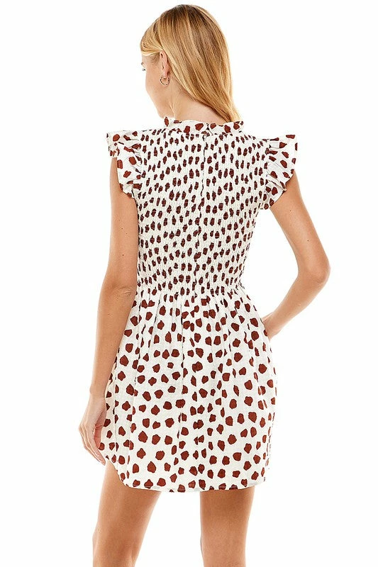 Mini flutter sleeve dress with a mock neck and smocked top. Features a high waisted skirt and a polka dot pattern.