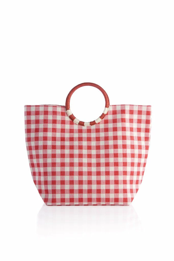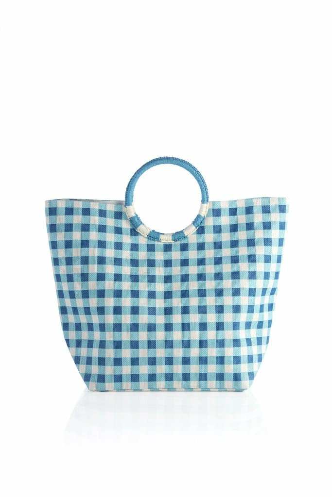 Paper straw tote with double handles, magnetic snap closure, and inner slip pocket