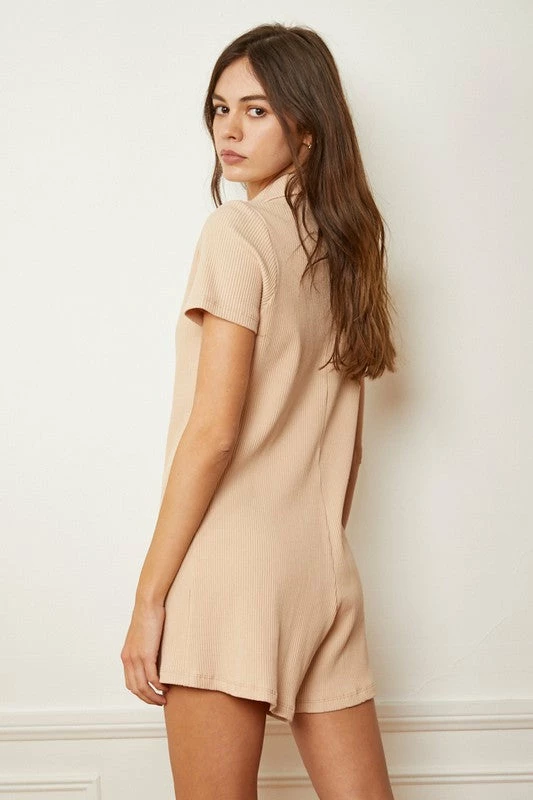 Short Sleeve Romper with Knit Ribbed Button Down and Collar Neck
