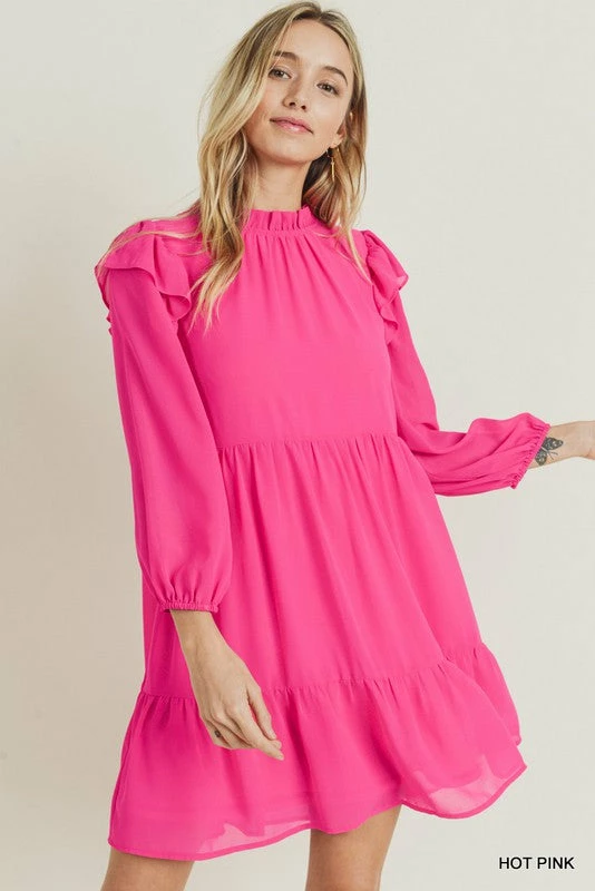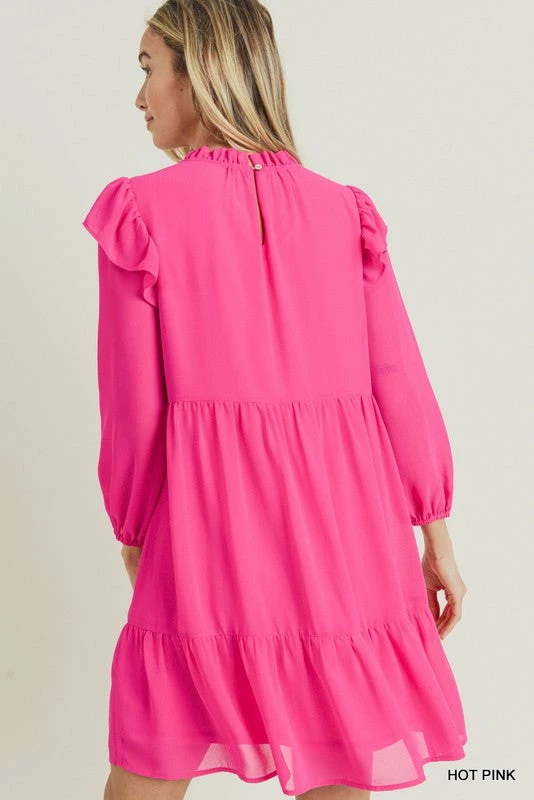 Solid Chiffon Dress With A Frill Mock Neckline, Shoulder Ruffles, Three Quarter Bubble Sleeves, And A Tiered Seam Construction Body