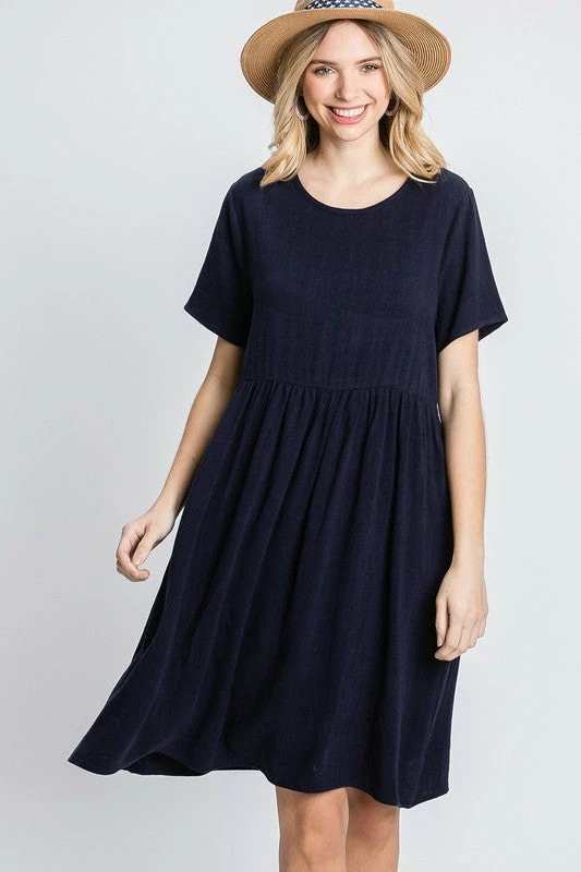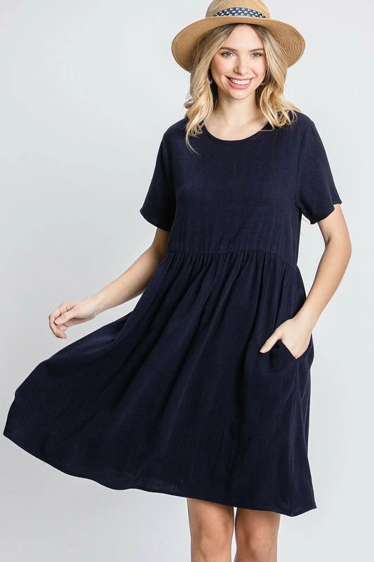 Baby Doll Style Dress With Keyhole And Button. Pockets On The Sides