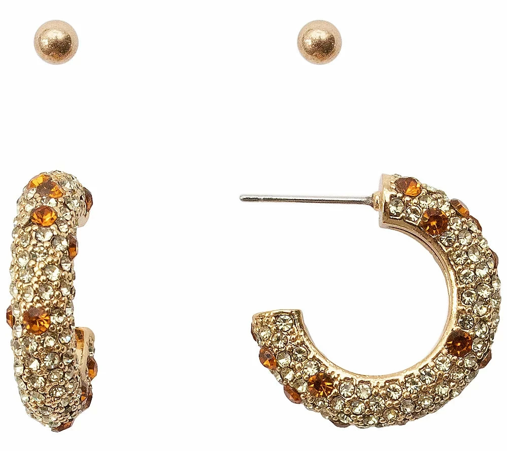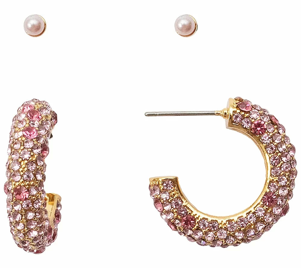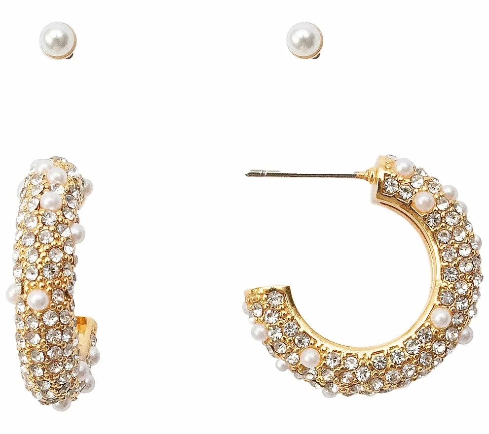 The perfect pair–sparkly crystal hoops and micro-pearl stud earrings come together to complement just about anything in your closet. From Violet & Brooks.