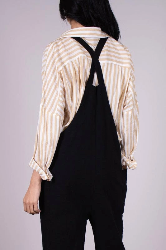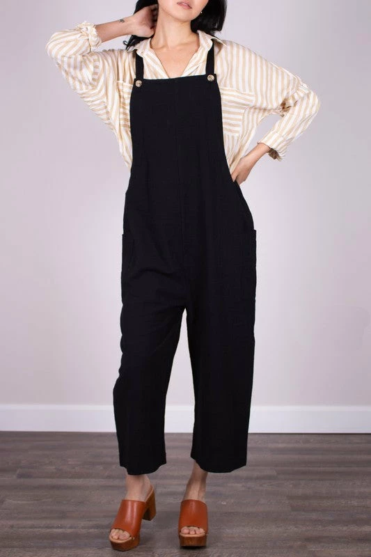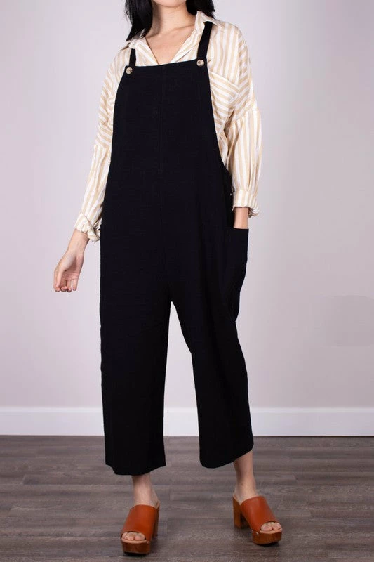 Cotton culotte overalls with adjustable button straps and side pockets.