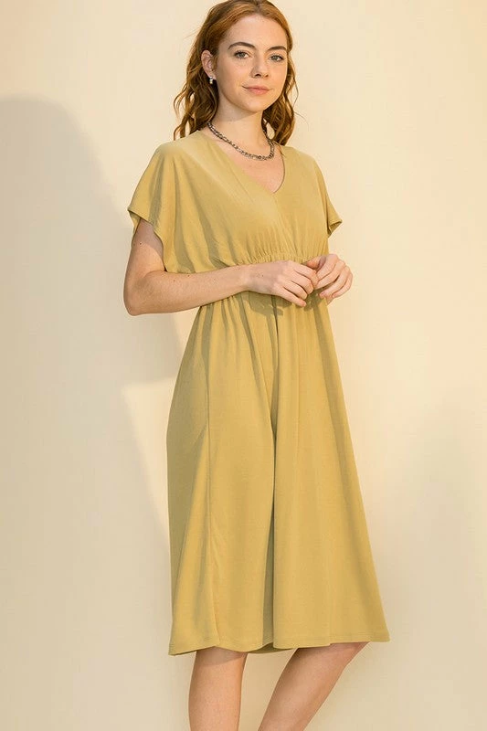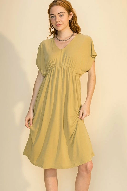 V Neck Dolman Short Sleeve Elastic Waist Midi Dress.