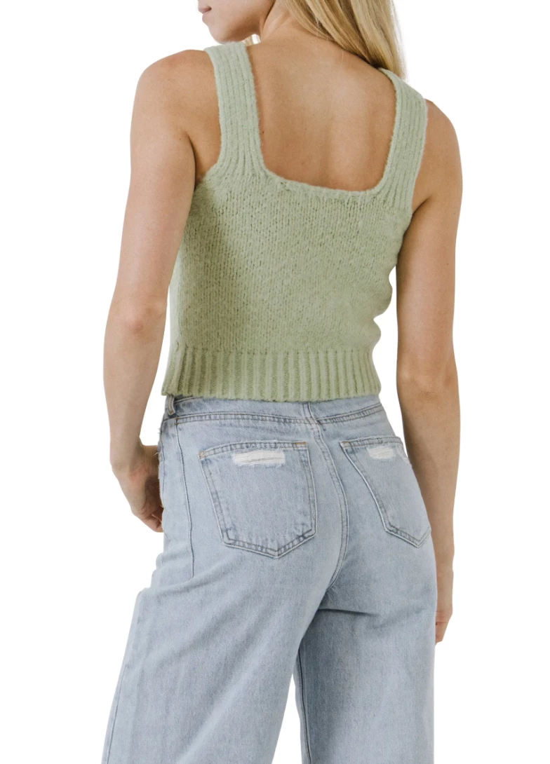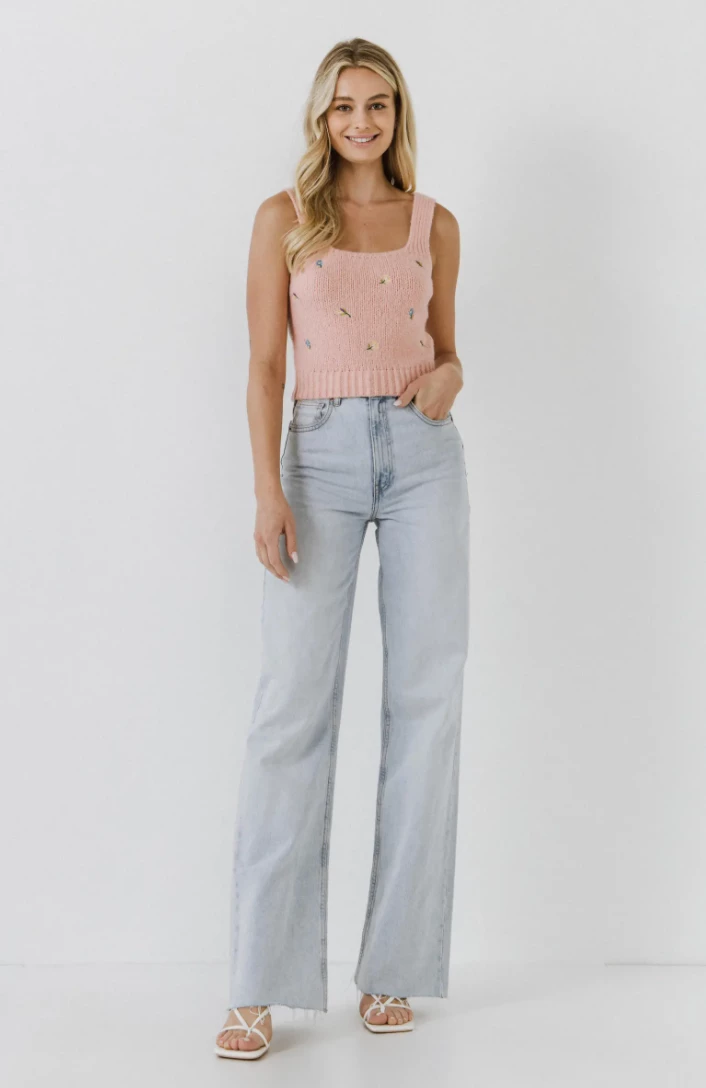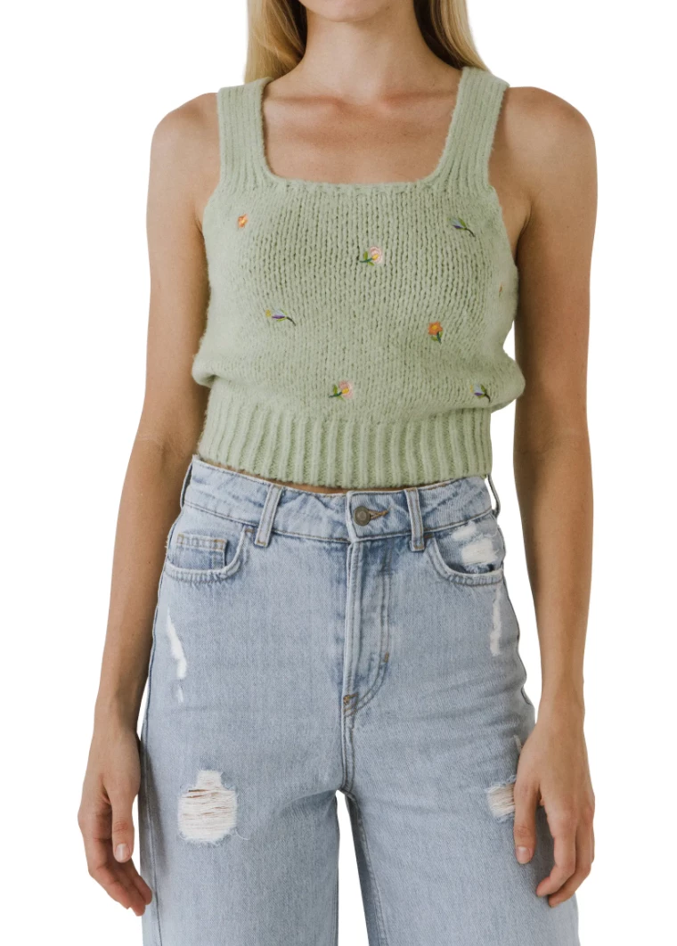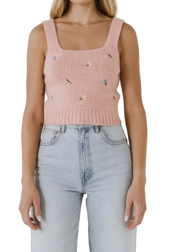 - Layer effortlessly with a soft-knit sweater-tank featuring delicate embroidered flowers for a look that pairs well with everything