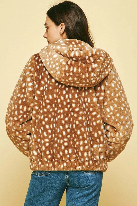 Animal Print Faux Fur, Side Pockets, Hoodie Jacket