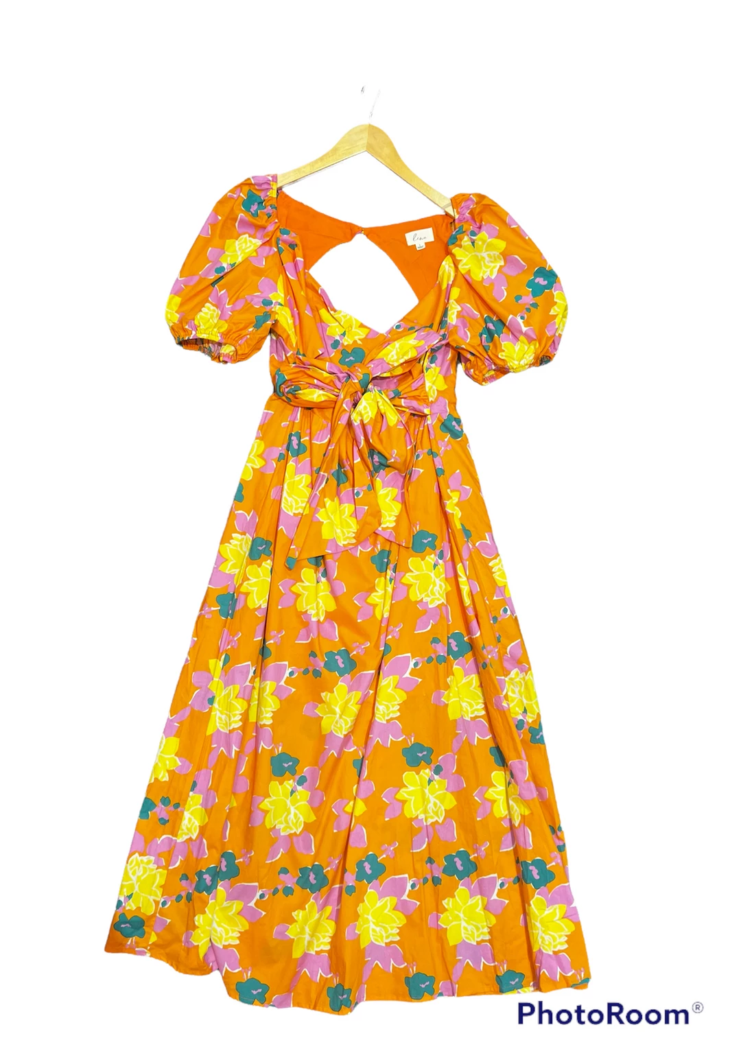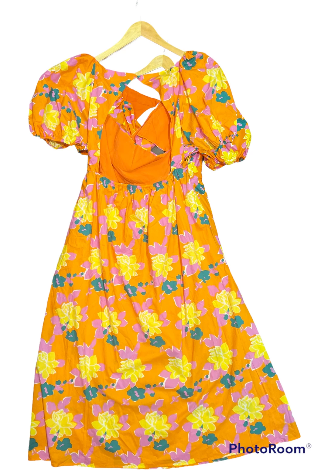 Orange, Yellow, And Green Floral Print Balloon Sleeve Midi Dress