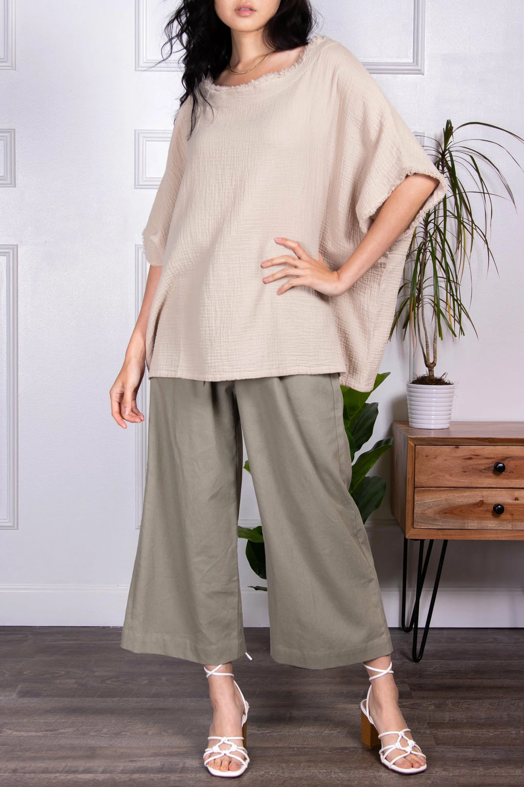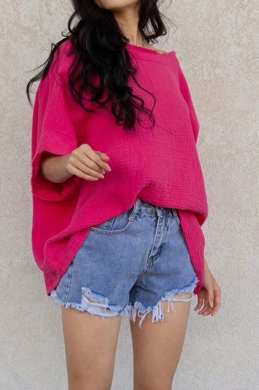 An oversized poncho top featuring gauze texture, raw hems, and a boat neckline.