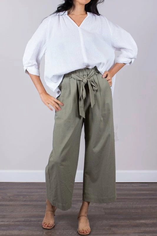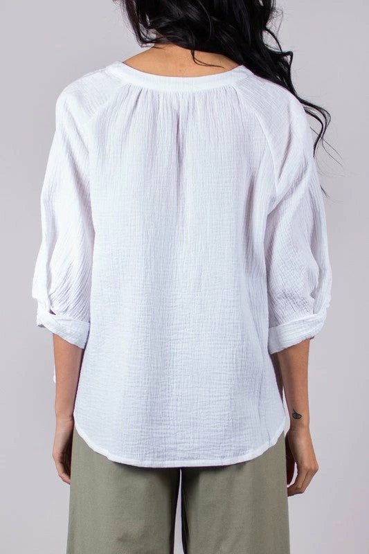 Relaxed gauze blouse with v-neck and twist knot sleeves.