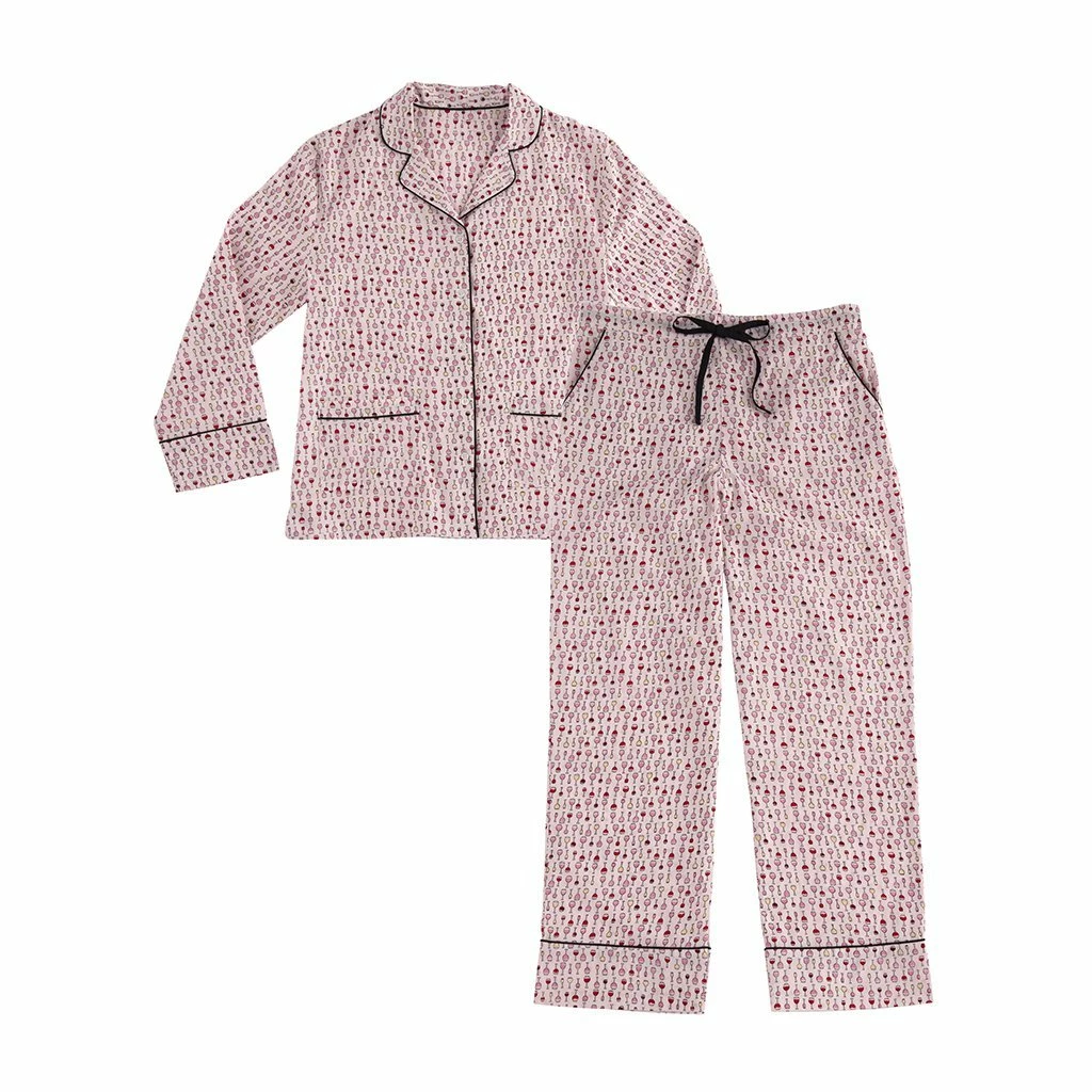 Nothing is better than slipping into Hope PJ set before a blissful night’s sleep. This set features a lively wine glass print upon a blush background, and black detailing along the lapels, pockets, and hemline which makes it the perfect set for every wine lover. Designed with comfort in mind, this set is made from cotton, features a drawstring waistline, and packaged ribbon wrapped, making it the perfect gift option. Pair with other items fromÂ