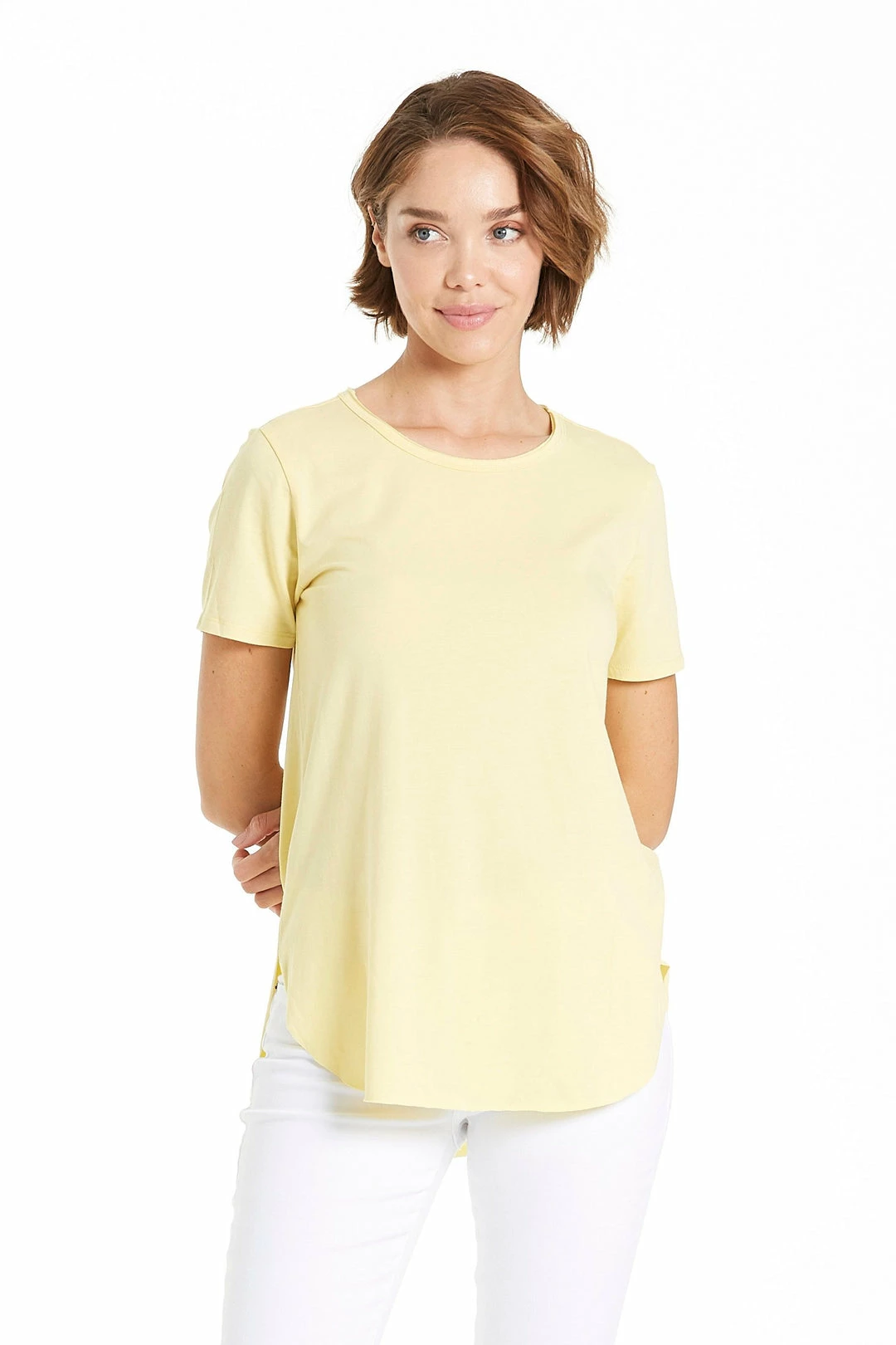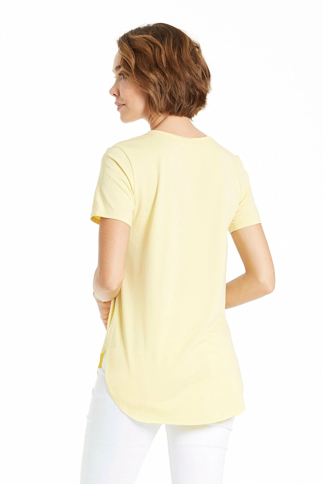 Crew neck short sleeved curved raw tee.