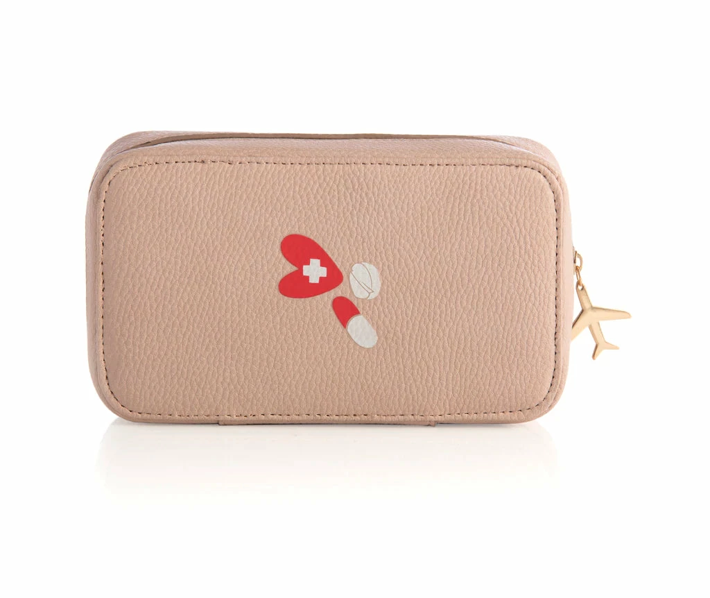 Cute medicine case for travel with top zip closure and four mesh compartments!