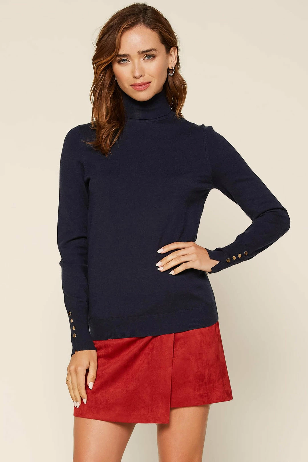 Long Sleeve Knit Turtleneck Sweater With Button Detail.
