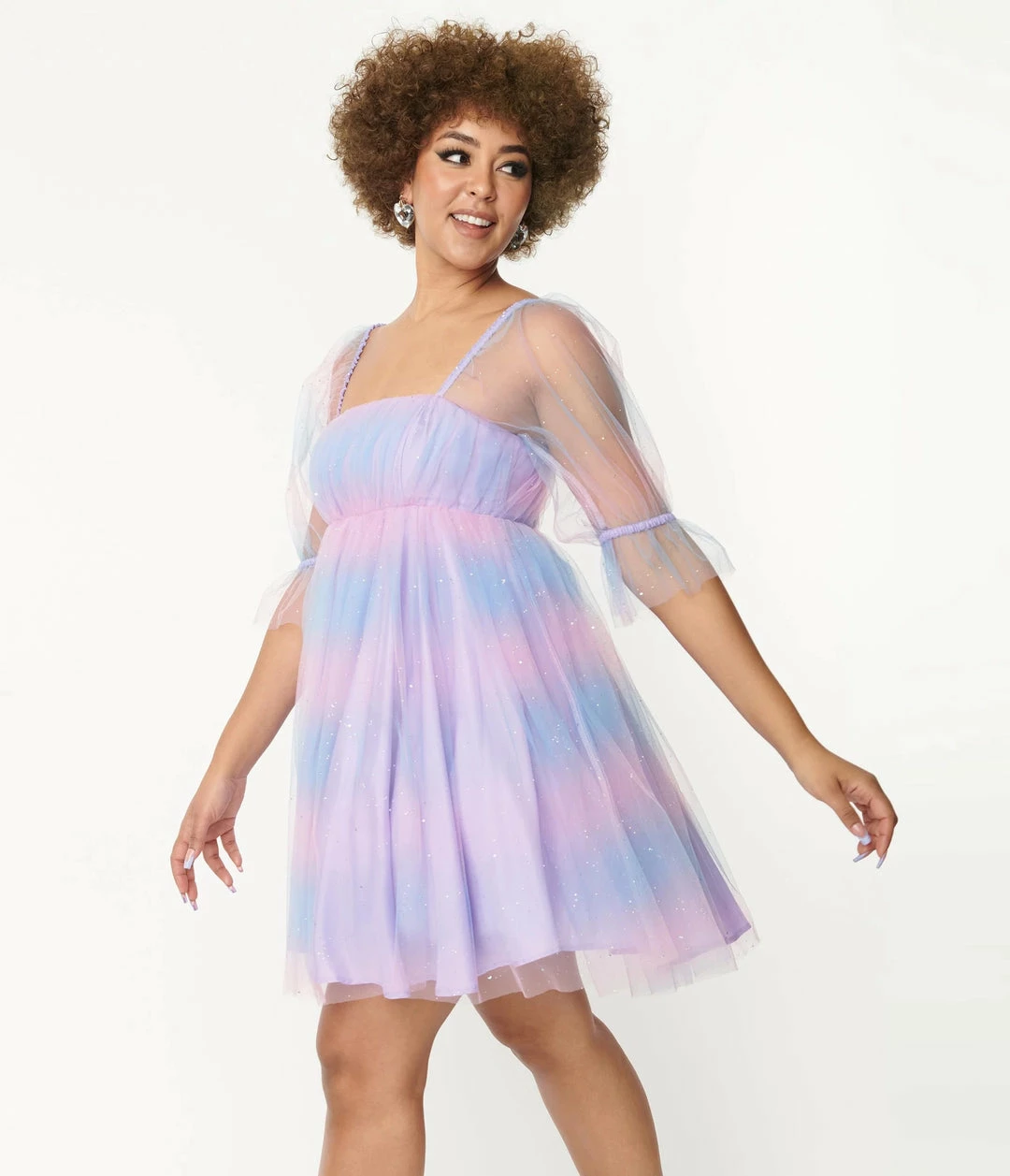Play with their hearts in the Love Interest Dress, a fresh babydoll from Smak Parlour. Crafted in a stunning pink and purple ombre mesh and sparkling with dainty iridescent stars and moons throughout, the high empire waist is cinched with a back zipper while the square neckline is framed by puffy half sleeves, structured with elastic cuffs and shoulders for versatile wear. The flirtatious flare skirt boasts a dash of tulle of the sultry flounce while purple lining keeps you comfortable!