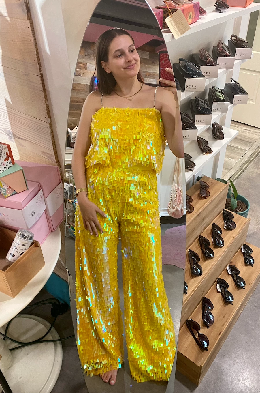Queen of Sparkles yellow rectangle sequin pants– pair with matching tank!
