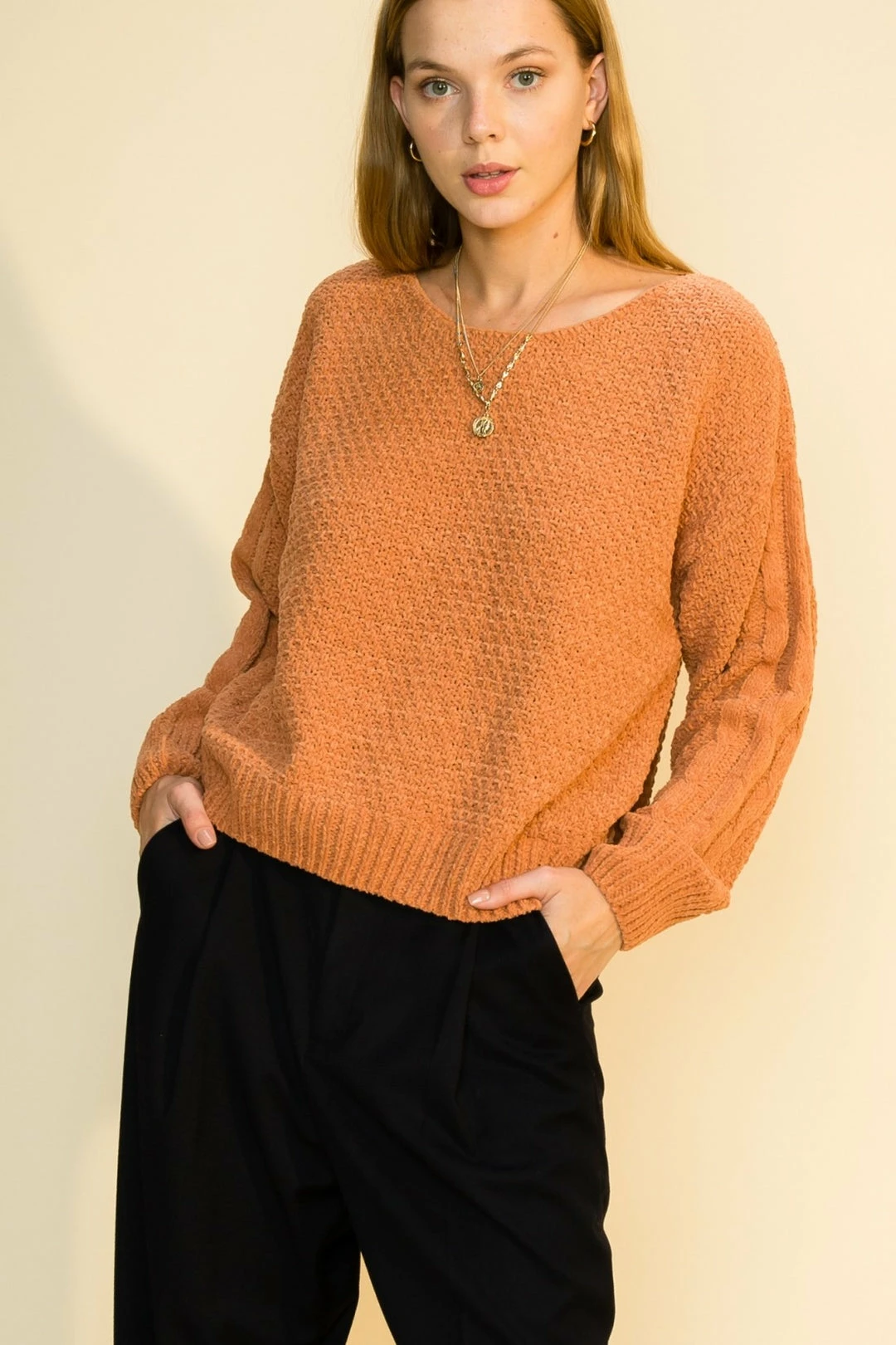 - Rounded Neckline, Balloon Sleeves, and Ribbed Knit Cuffs