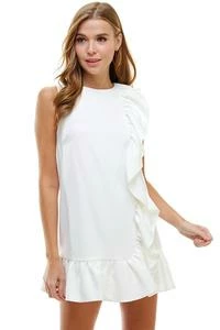 Has dropped waist and ruffle hem and vertical ruffle along the left seam