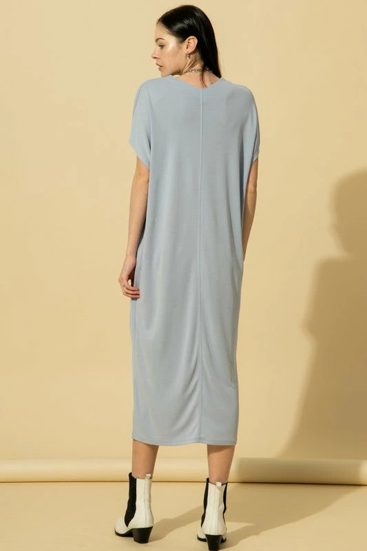 V NECK DOLMAN SLEEVE PLEAT FRONT MIDI DRESS