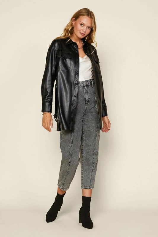 Long Sleeve Vegan Leather Shacket With Waist Belt