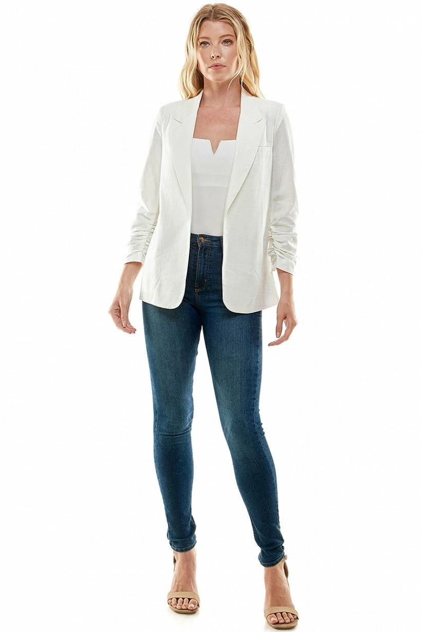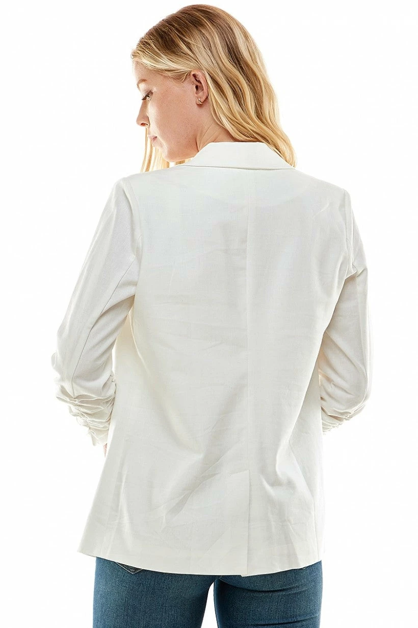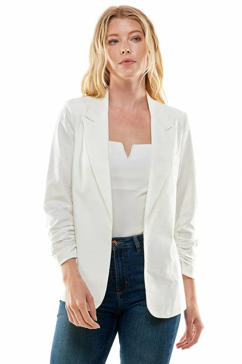 White linen blazer, featuring gathered long sleeve design and a classic silhouette.