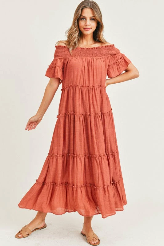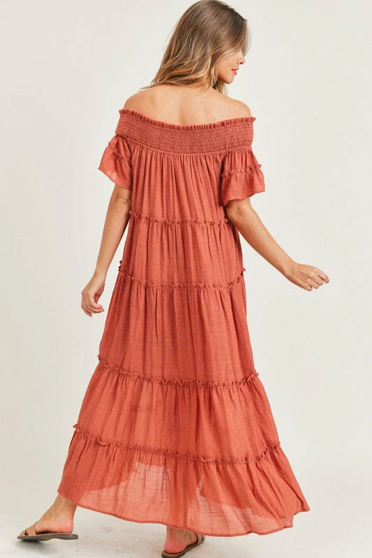 Has an elasticized off shoulder neckline, short bell sleeves, and tiered layers.