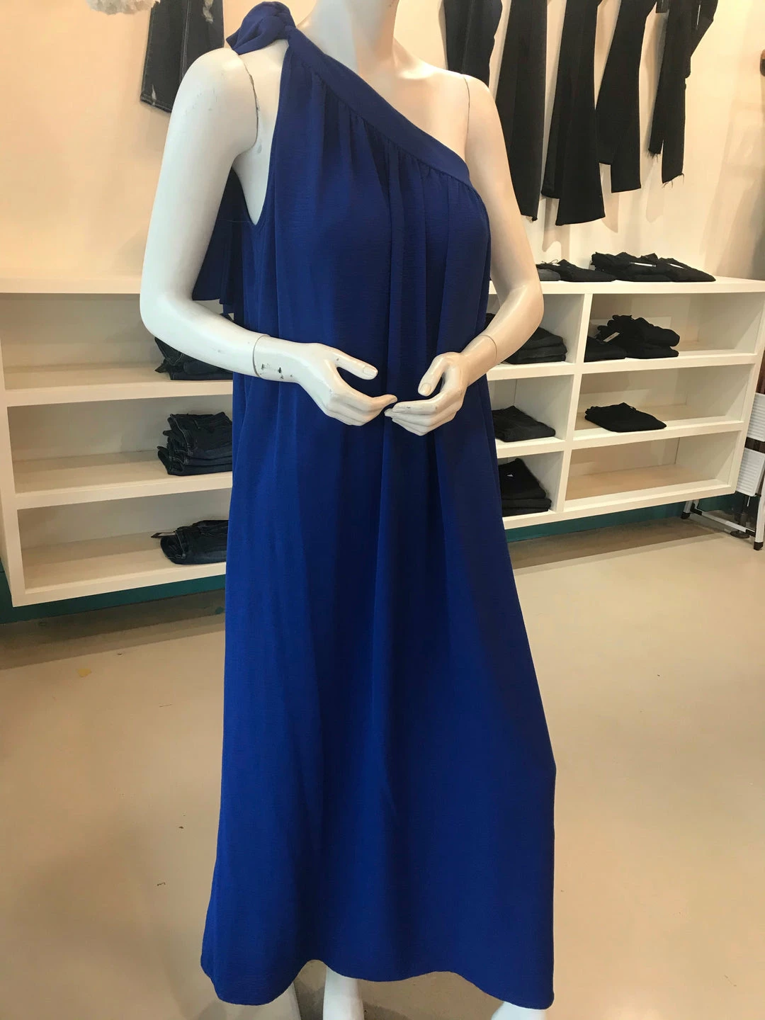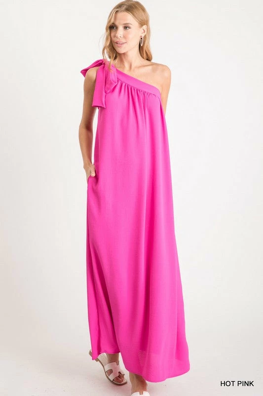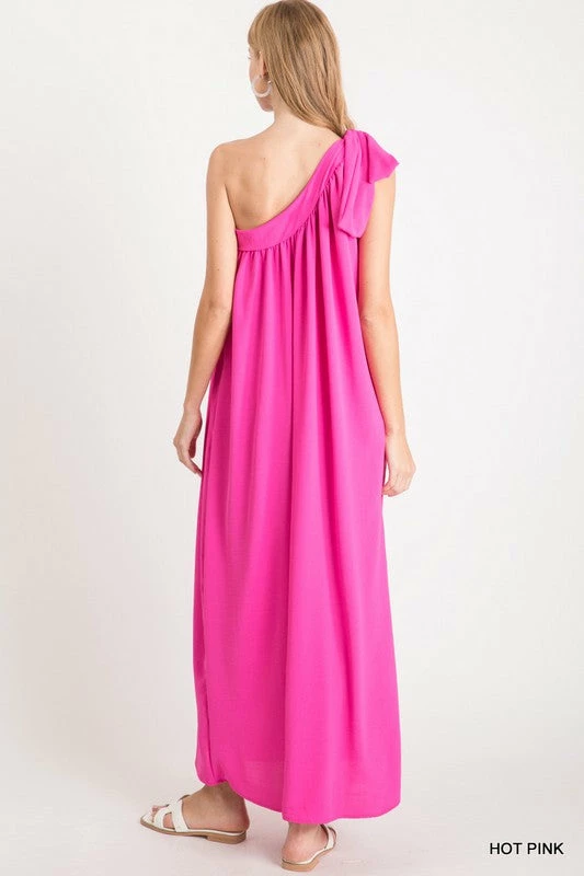 Solid One Shoulder Maxi Dress With A Self-Tie Shoulder, Ruched Neckline, And Side PocketsÂ