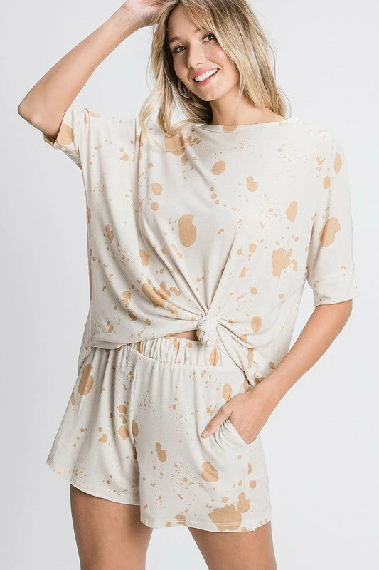Print Round Neck Hi-Lo Hem Top And Drawstring Waist And Pocket Detail Bottom Set. Raw Edge Detail