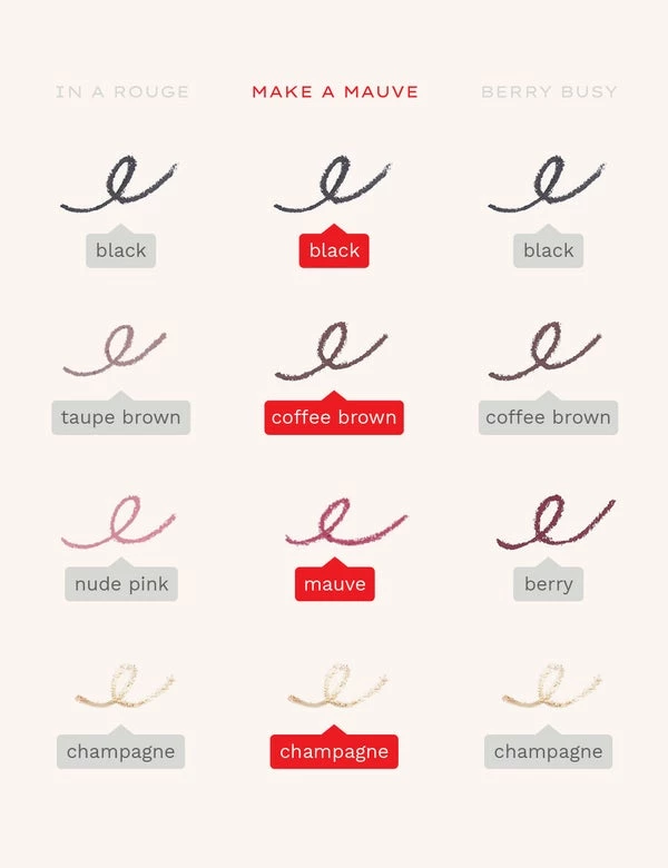 - Black eyeliner, medium brown brow liner, mauve lip liner, champagne highlighter