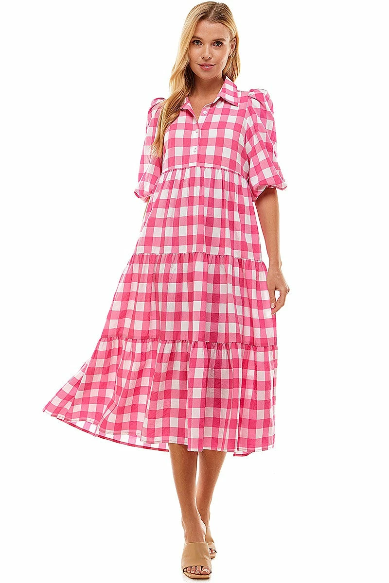 Tiered midi dress with midi length bubble sleeves, a button up design, and collar.