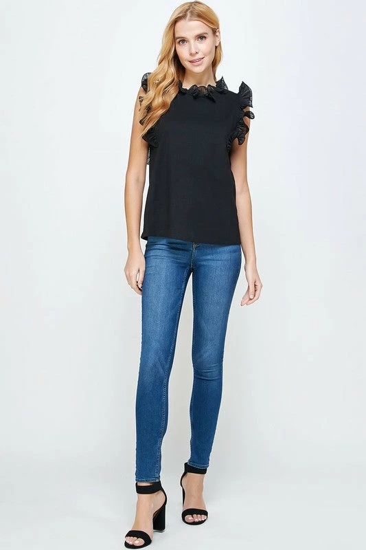 Sleeveless pleated contrast knit top. This style features a rayon knit bodice, and contrast woven pleated fabric at neck/shoulders.
