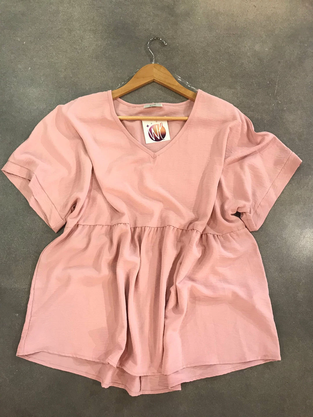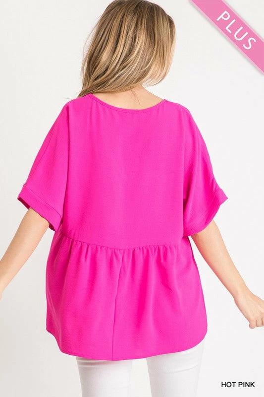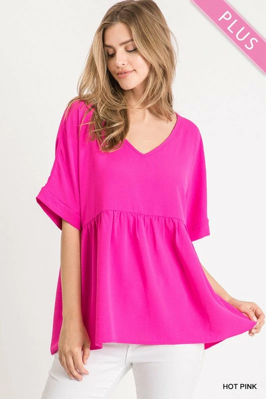Plus Size Solid V-Neck Baby Doll Top With Short Dolman Sleeves