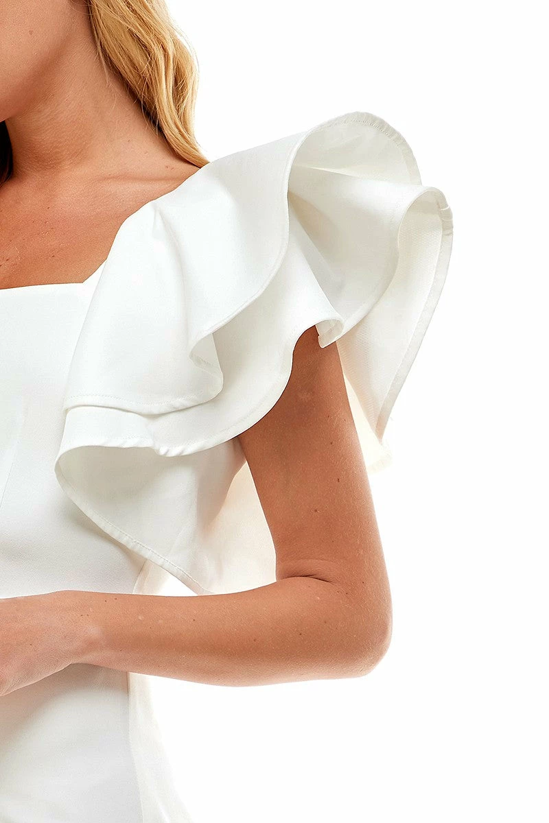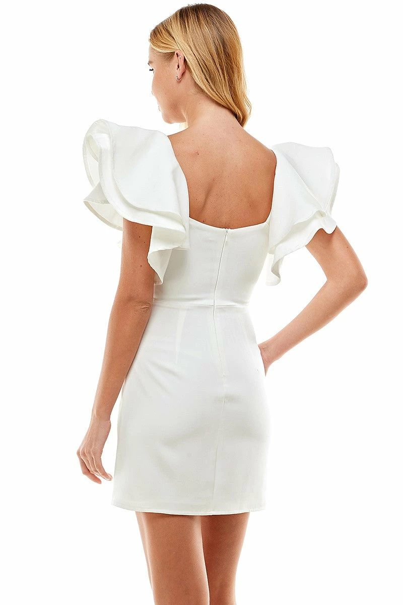Thigh length dress featuring a square neckline, high waist, and loose ruffle sleeves. Square back and hidden zipper.Â