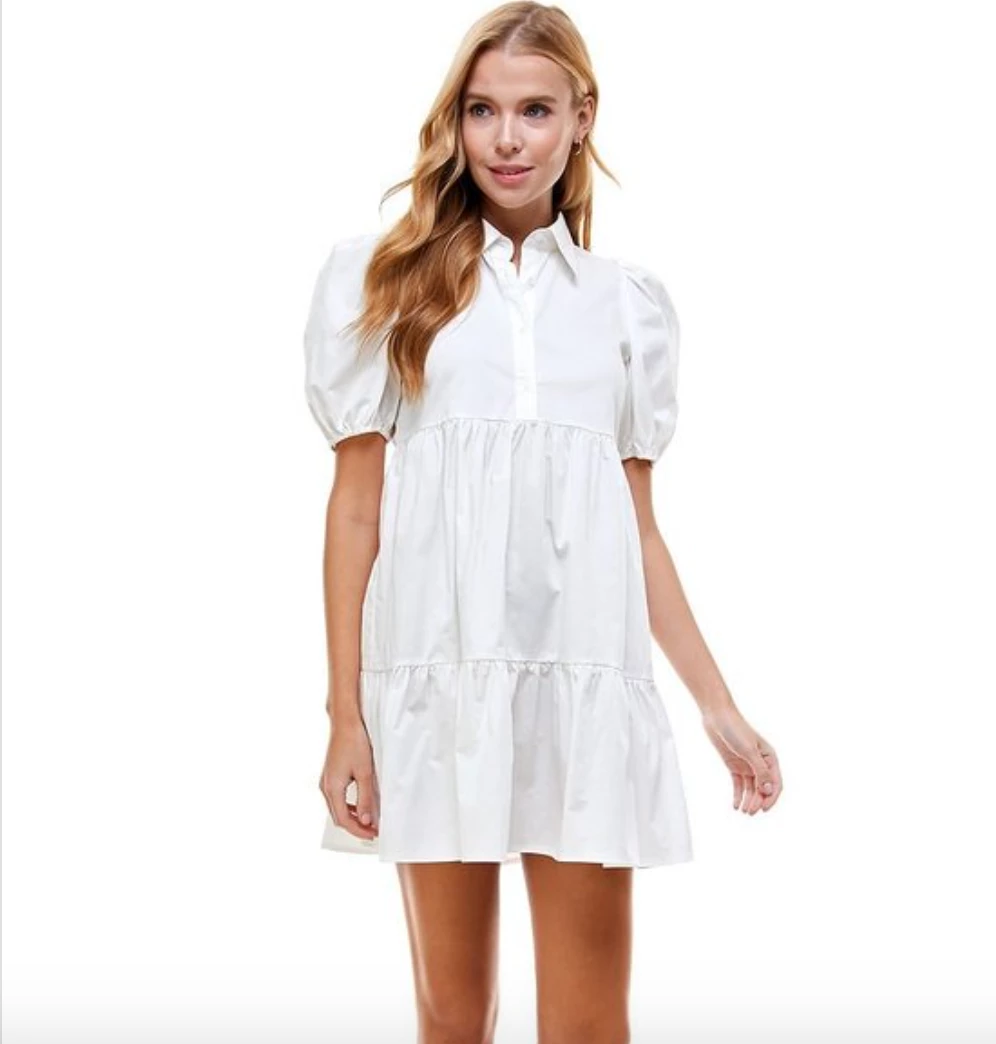 Poplin shirt dress with puff shoulders and tiered ruffles.Â