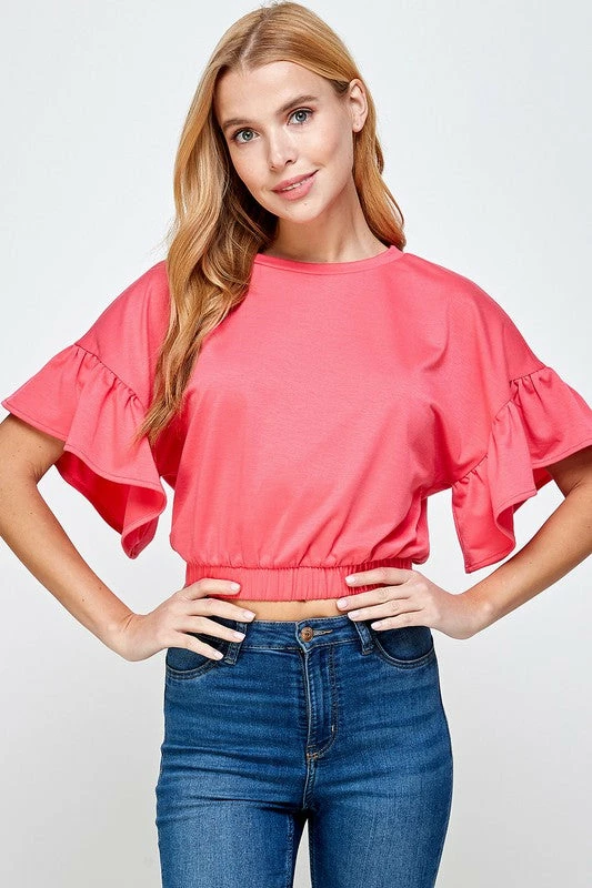 Ruffle Short Sleeve Top In Stretch Knit Fabric. This Style Features Round Neck, Cropped Length, Ruffled Short Sleeves, And Elasticated Hem.Â