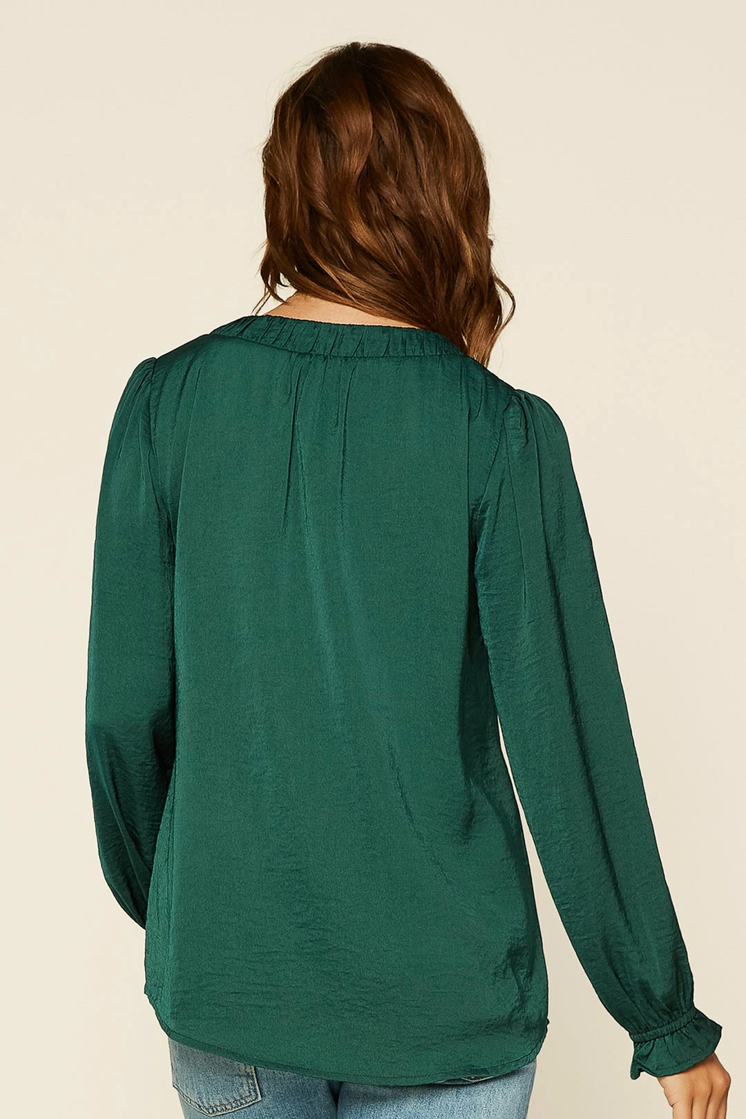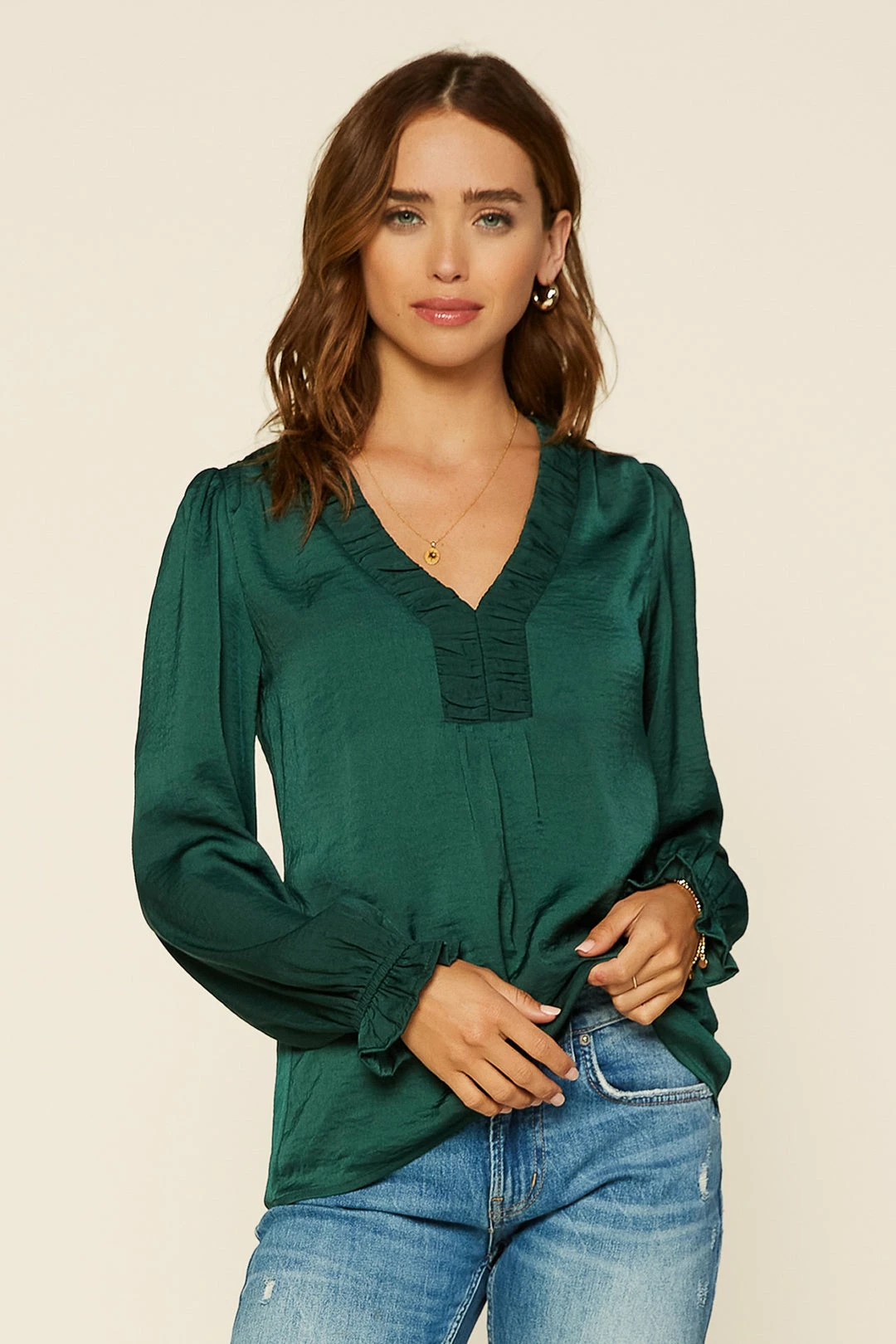 Long Sleeve Shirred Woven V-Neck BlouseÂ