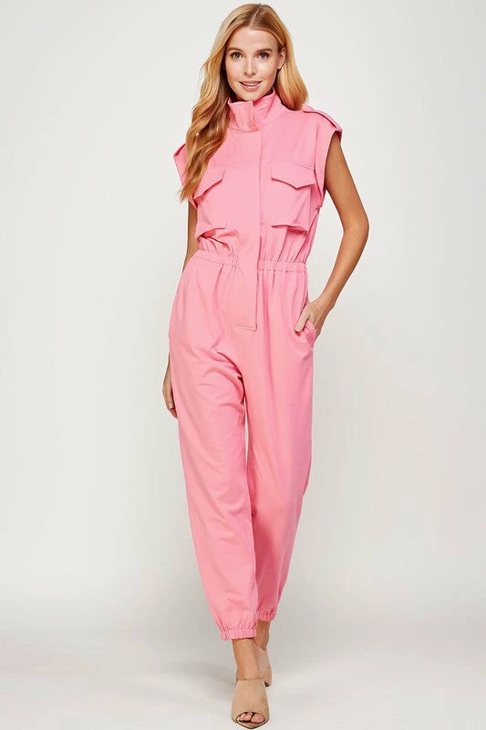 Pocket detail high neck sleeveless jumpsuit in Cotton stretch fabric. This style features folded sleeves with shoulder epaulettes, chest flap pockets, cinched elasticated waist, ankle length pants with elasticated cuff, and concealed front zipper closure.