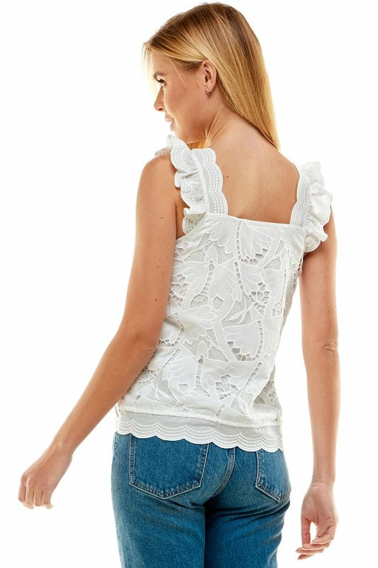 Lace top with sleeveless design and white detailing along straps, neckline, and hemline.