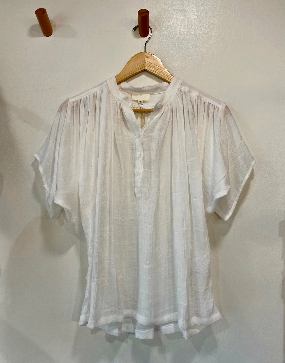 Slub fabric short sleeve blouse with front buttons and ruching along the shoulders and backÂ